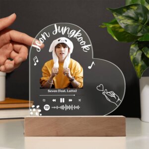 Set on a sleek wooden LED base with 7 dreamy color modes, it creates the perfect vibe for your bedroom, workspace, or K-pop shrine. USB-powered for easy use, it’s both stylish and practical, making it the ultimate collectible or gift for any Jungkook stan. This plaque isn’t just a product – it’s a piece of your heart 💖