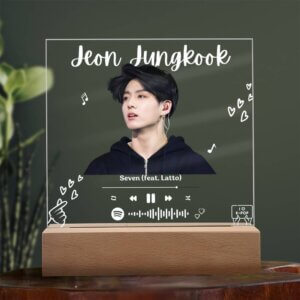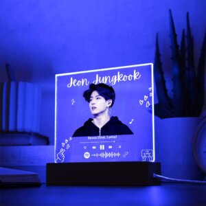 Set on a sleek wooden LED base with 7 dreamy color modes, it creates the perfect vibe for your bedroom, workspace, or K-pop shrine. USB-powered for easy use, it’s both stylish and practical, making it the ultimate collectible or gift for any Jungkook stan. This plaque isn’t just a product – it’s a piece of your heart 💖