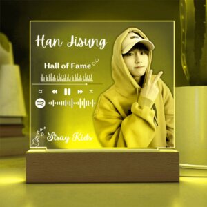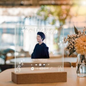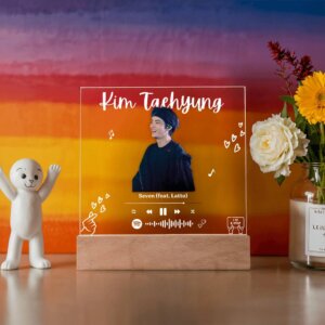 Set on a sleek wooden LED base with 7 dreamy color modes, it creates the perfect vibe for your bedroom, workspace, or K-pop shrine. USB-powered for easy use, it’s both stylish and practical, making it the ultimate collectible or gift for any Kim Taehyung stan. This plaque isn’t just a product – it’s a piece of your heart 💖